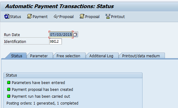 For our example, run the AP payment program by executing transaction code F110 or following the menu path Accounting > Financial Accounting > Accounts Payable > Periodic Processing > Payments. Figure 59 shows the AP payment program run.