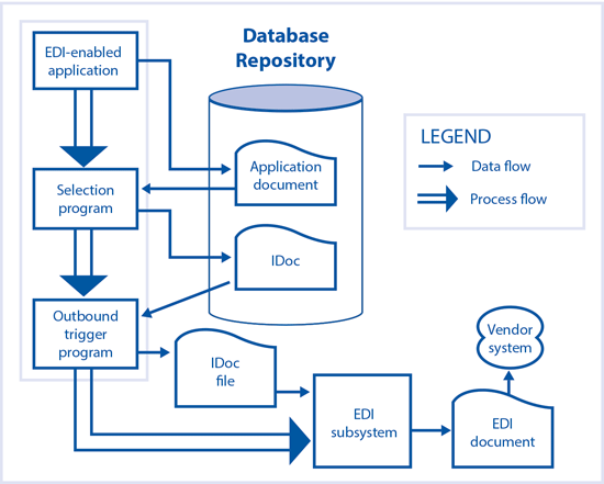 When in an EDI-enabled application such as an SAP system an application document is created, an output program is triggered by selection parameters — for example, a purchasing organization, vendor, or document type (Figure 1). An example of an application document is a purchase order (PO). This output program triggers an outbound IDoc. The outbound IDoc is converted to an EDI document by an EDI subsystem. This EDI document, which is in text, SML, XML, or any other EDIFACT format, is transmitted to a vendor system. In Figure 1 the box on the left with EDI-enabled application, Selection program, and Outbound trigger program represents the actions that take place in the SAP system.