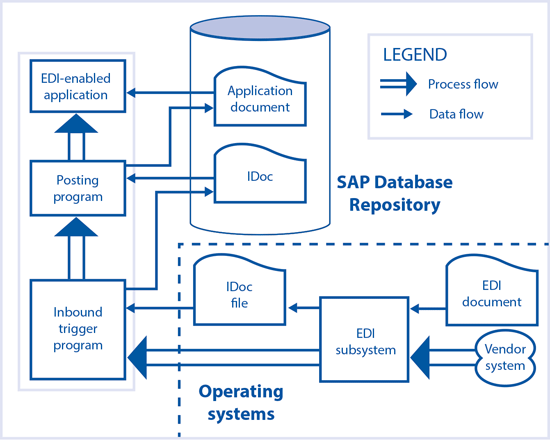 When an EDI document is received in an EDI subsystem, it converts it to an IDoc file. IDoc files are processed by an inbound trigger program (function module). This function module is triggered by selection parameters maintained in a partner profile setting. The IDocs are then posted in the SAP system (Figure 2). In Figure 2 the box with the EDI-enabled program, Posting program, and Inbound trigger program represents the actions that take place in the SAP system.