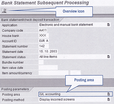The manner in which you delete financial documents depends on the settings of your particular system. In the Posting parameters field at the bottom of the screen, choose the type of postings for the documents you want to delete. Choose posting area G/L accounting for documents posted to the bank G/L, and Subledger accounting for postings that clear open items. The settings for the Posting method field in the FEBA selection screen are not relevant for finding document numbers. Note that it is possible that your system has been configured in such a way that subledger accounting is not used, so information regarding that posting area may be irrelevant for your system.