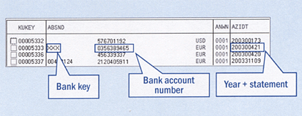 On the output screen, you will see a list of bank statements (Figure 2). The lines of the report contain some information on the bank statement, including the bank key (XXX) and account number (0356389465) along with the year of the bank statement followed by the bank statement number (200300421). You do not get the company codes for the bank statements, nor are you given any other organizational objects, so you'll need to note these fields to find the bank statements that need to be deleted.