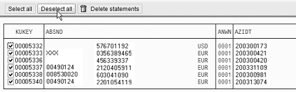 You can now select the item — or items — that you want to delete by clicking the check boxes in front of the KUKEY fields. When you click on the Delete statements button, the selected bank statements will be deleted.