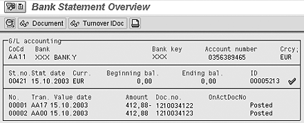 Once the FEBA selection screen is complete, click on the overview icon, which features a mountain scene and is located at the top of the screen. In the bank statement overview screen, there is a line with the bank data. Double-click on the line and bank statement information appears. Double-clicking on one of these lines reveals the screen shown in Figure 5. Record the document numbers, because these are the documents that need to be deleted.
