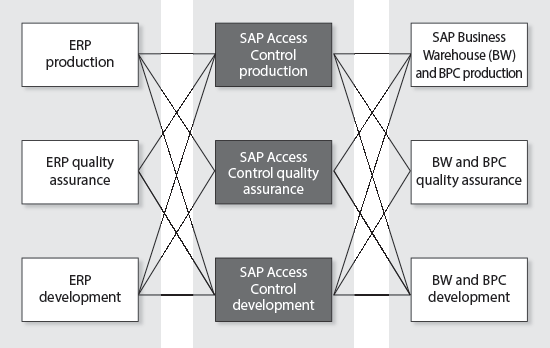 The following process outlines the steps needed to configure cross-system Access Risk Analysis between your ERP and BPC landscapes in your SAP Access Control environment. Each step includes commentary explaining what that step does and, if appropriate, an explanation about why it is needed. This scenario assumes an SAP ERP landscape, an SAP BW or BPC landscape, and an SAP Access Control landscape as shown in Figure 1.