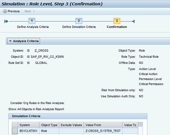- Test cross-system SoD risk with transaction code KS01 in a role on the ECC system and a second role on the BW or BPC system containing S_TCODE Z_BPC and appropriate UJ_TASK values (e.g., P029 – Post Journals). For example, in the SAP Access Control system, I navigated to Access Management > Access Risk Analysis and clicked the Role Level Simulation link. I ran my role simulation against two roles: one in my ERP environment and one in my BW/BPC environment. Simulation details were as shown in Figure 12.