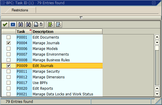 - Z:CROSS_SYSTEM_TEST is the test role in the BPC landscape containing transaction code Z_BPC with the BPC task IDs assigned (Figure 13 shows the task IDs assigned to the UJ_BPCTASK Z:CROSS_SYSTEM_RISK role in my BW landscape). In this test, I assigned both BPC task P0004 (Manage Journals,) and P009 (Post Journals) to the Z:CROSS_SYSTEM_TEST role. Both of these tasks would be considered BPC tasks that belong in the GL01 – Post Journal Entry function in the SAP Access Control rule set