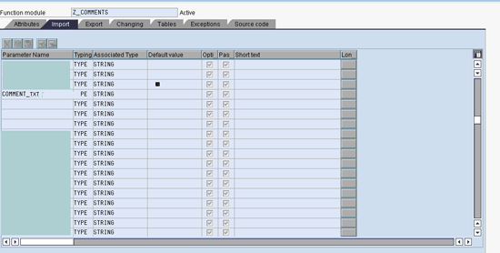 You do not need to configure the other input parameter Comment because it is not expected as an input parameter by the function module.