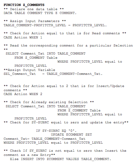 The scalable ABAP code can be extended according to your requirements. We provide a pseudo-code that provides you with an example of how to use ABAP to carry out the comment functionality (