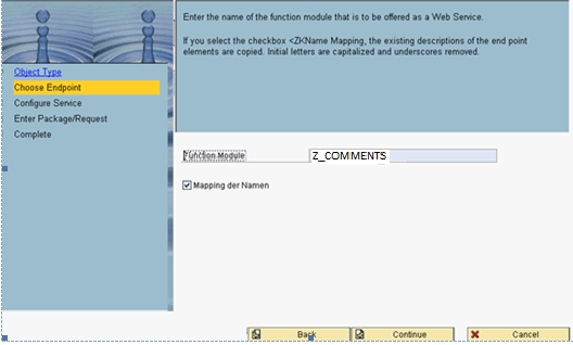 Click the Complete button on the next screen. You have created a Web service for function module ZCOMMENTS_F.