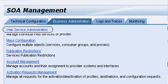 To bind the Web service, use the Service-Oriented Architecture (SOA) Management tool. Use transaction SOAMANAGER in SAP NetWeaver BW. The SOA Management screen opens in the Web browser. Under the Business Administration tab, click the Web Service Administration link (