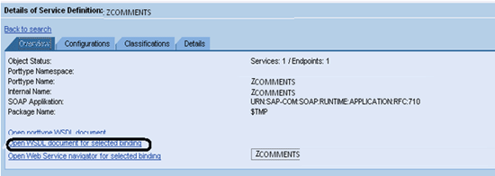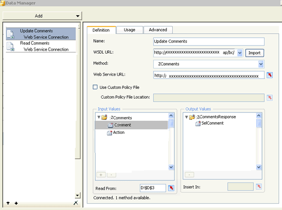 You must map the Web service connections you just created to the Web service ZComments that you created in step 4. Open the Read Comments connection you created and click the Definition tab. Copy the binding link (Web service URL) from step 4 (