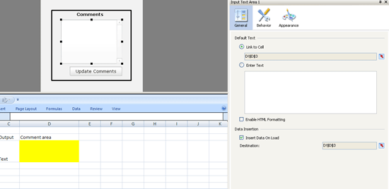 Select the text area component, right-click it, and then choose Properties. Map cell D3 to the Link to Cell option. This mapping ensures that comments are linked to D3 in SAP BusinessObjects Dashboards as shown in