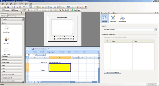The next step is to trigger this connection, which should occur when someone clicks the Update Comments button on the dashboard. To configure this trigger, close the Data Manager window to return to the SAP BusinessObjects Dashboard Design screen. Select the Update Comments button, right-click it, and choose Properties (