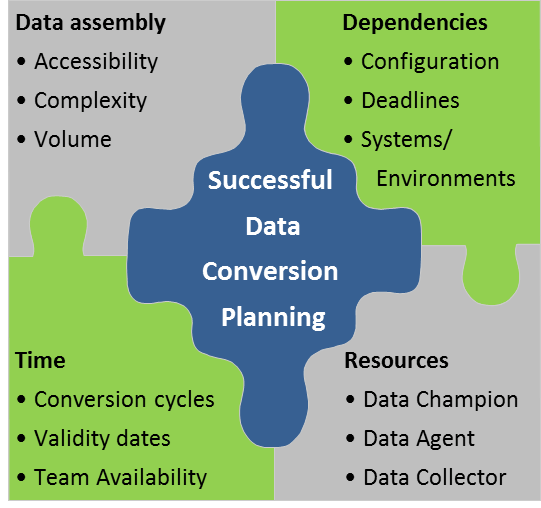 Lastly, time and resources are key considerations to take in account. Time in this case does not refer to the project deadlines, but refers to the number of conversion cycles (also known as mocks) that will be executed, the scope of those cycles, and the validity periods of the conversion (in other words, how far back in time you are going to convert for the first cycle). It is common for project managers to allocate time based on the volume of the data. However, these other additional variables that were previously mentioned—namely, accessibility and complexity—also need to be considered, as well as the deliverable deadlines of other phases of the project. Allowing enough time for the conversion results in better data, better testing, and an overall smoother deployment. To accomplish this, you need to allocate time for the data-related activities and not the volume as a stand-alone variable.