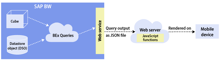Let’s begin with an overview of SAP BW and BEx Query creation (Figure 1). On the left side of the illustration is SAP BW. Here you see a cube and DataStore Object (DSO). These are representative objects for any existing InfoProviders you might have in your SAP BW system. Similarly, the BEx Queries shown are any existing BEx Queries in your SAP BW system. Later in this article we explain how to create the web-service components inside SAP BW that convert the output of the BEx query into a JavaScript Object Notation (JSON) file format, which will be interpreted or presented on the mobile device by the web server. In addition, we provide a snippet of the JavaScript code as well, to highlight the critical components.