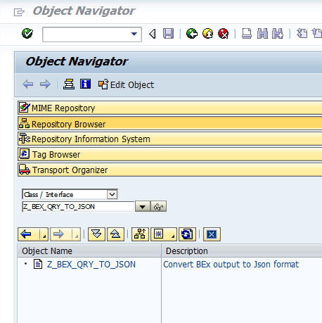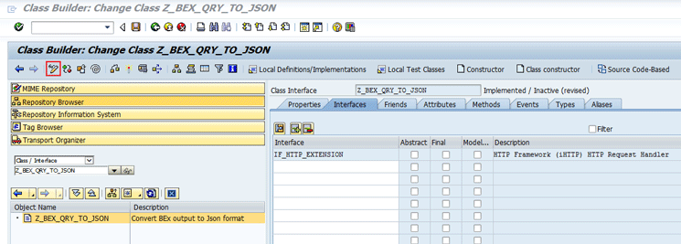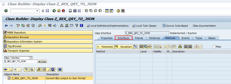 Double-click the Object Name (in this example, Z_BEX_QRY_TO_JSON), which opens the screen in Figure 12. Click the Interfaces tab to open it.