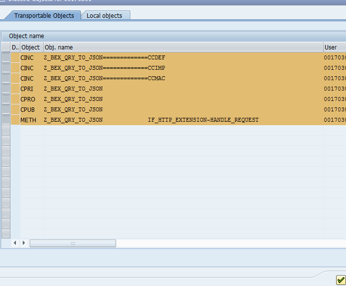Once the new method is saved, you receive a success message. Click the activate icon in the ribbon in the screen (not shown) to activate the new code. This opens a dialog window that shows the components to be activated (Figure 18). In the Transportable Objects tab, select all the relevant components and click the green checkmark icon.
