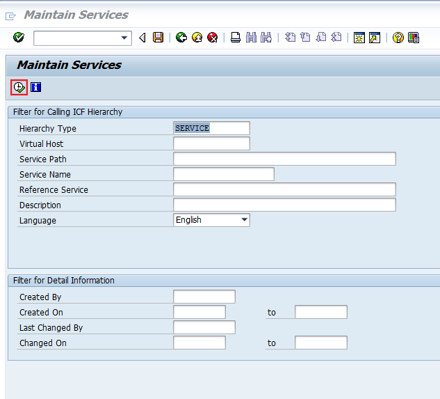 The next step is to create a definition for your new web service. Start at the initial screen (Figure 2) to create the web-service definition, but this time enter /nSICF in the field (to execute transaction code SICF), and press Enter. This results in the screen shown in Figure 19. Enter SERVICE as your Hierarchy Type and English as the Language. Then click the execute icon.