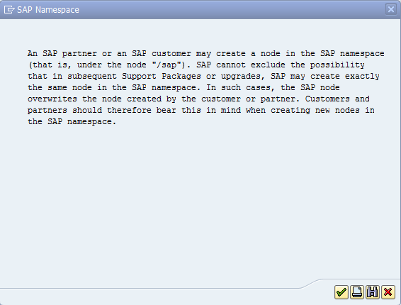 This opens a dialog box (Figure 21) with the Namespace information. Click the green checkmark icon and the screen in Figure 22 opens.