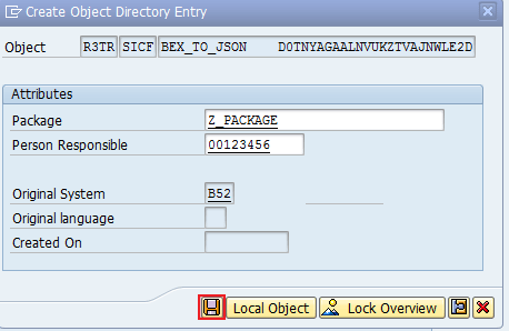 In the screen that opens (Figure 7), enter the appropriate Package name (Z_PACKAGE_NAME in this example) and the log-in ID of the Person Responsible. The Original System and Original language have default values per your system configuration. Then click the disk icon