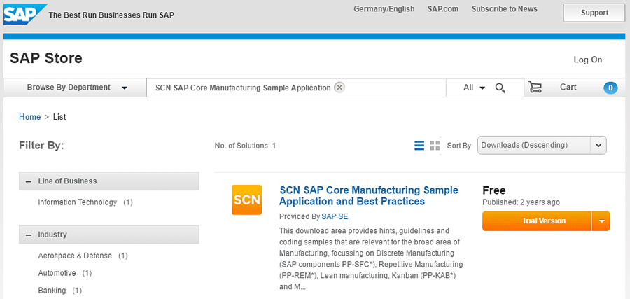 Search for the SCN SAP Core Manufacturing Sample Application and Best Practices package in the SAP Store
