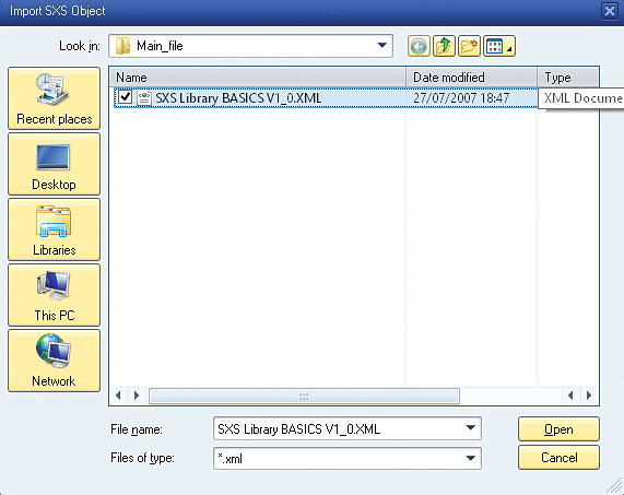 In the pop-up screen that appears (Figure 5), select the file named SXS Library BASICS V1_0.XML under the previously mentioned folder, XML_files_V_1_0, and then click the Open button.