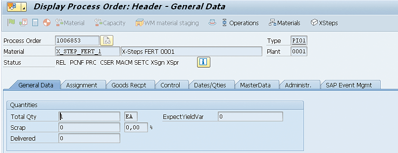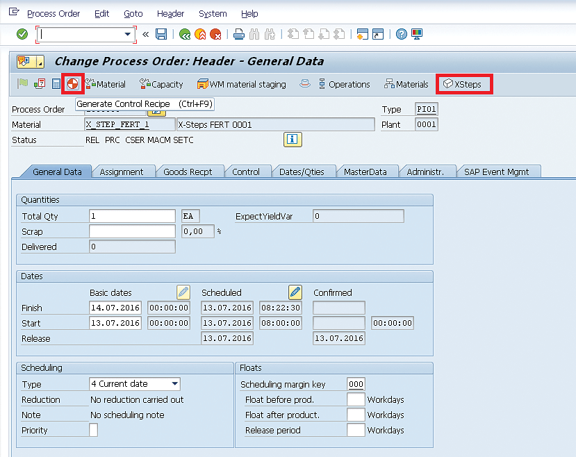Now that you have a master recipe with a reference to the standard XStep, you can create a new process order and generate the control recipe.