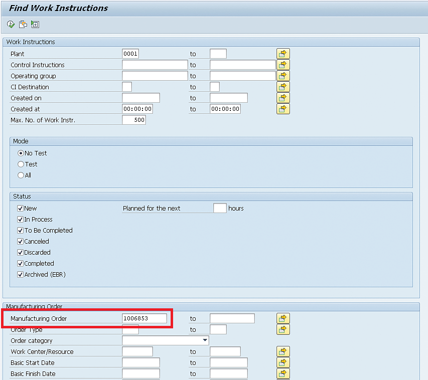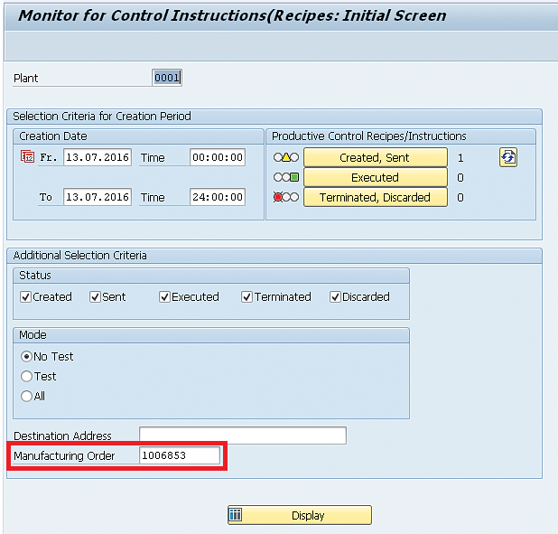 Now that you have generated the control recipe, you can find it and also send it by executing transaction code CO53XT (Control Instructions/Recipes Monitor). This action displays the screen in Figure 18 in which you use the order number as an input parameter to enter in the Manufacturing Order field.