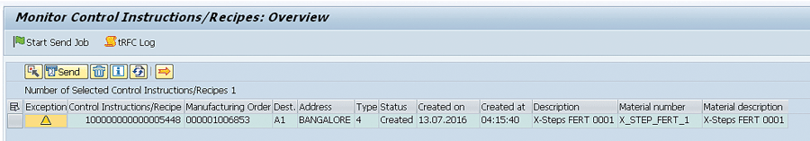 In Figure 19, you see the generated control recipe. You have two options to send this recipe. You can click the Start Send Job button to trigger program RCOCB006 on a background job and the control recipes or you can send the control recipe online by clicking the Send button.