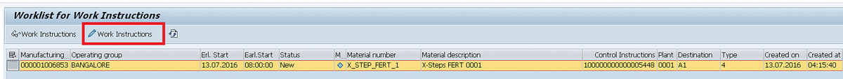 Select the row in which the work instruction details are displayed and click the edit Work Instructions button to process the PI sheet, as highlighted in Figure 21.