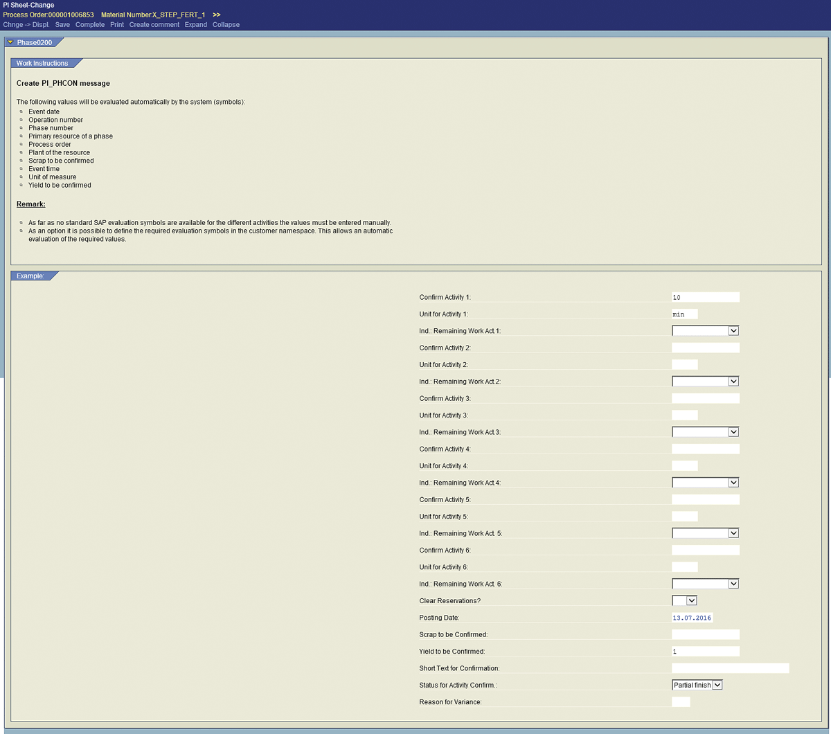 Process instruction (PI) sheets are the default option in the chemical and food industry to integrate and report actual data from the manufacturing process with external process control systems. PI sheets can be used to display process order data or to execute actions on the order, such as posting confirmations or goods movements.