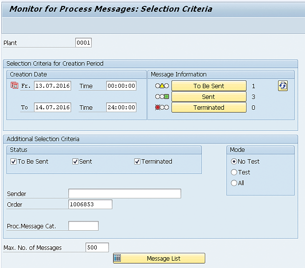To send the process messages, execute transaction code CO54XT. This action displays the screen in Figure 24. You can either provide your process order number and click the Message List button to see the messages from this specific order or click the To Be Sent button to see all the process messages to be sent. Because the process messages already sent are not relevant in this moment and there is only one process message to be sent, you can click the To Be Sent button.