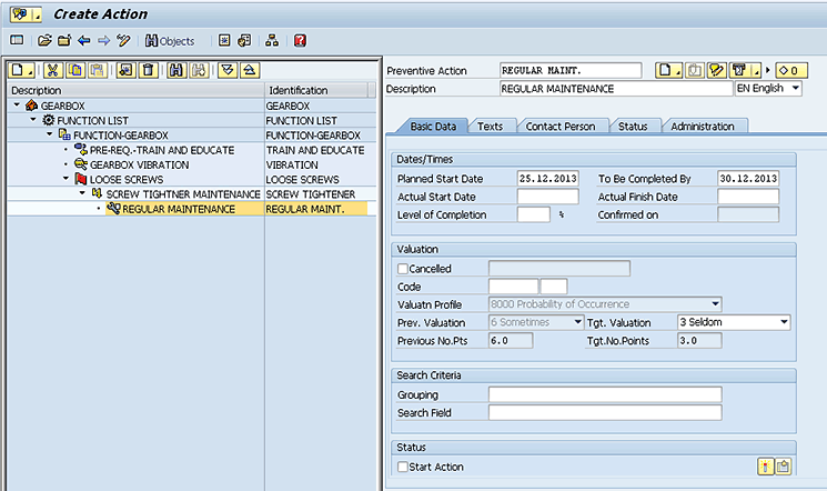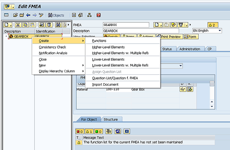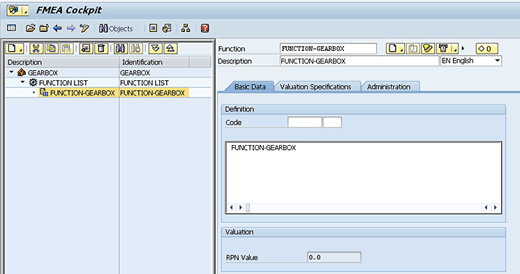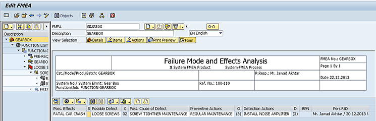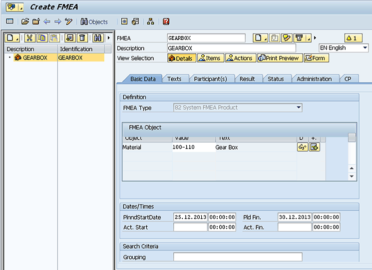 In the FMEA Type field select either System FMEA Product or System FMEA Process. In my example I selected 82 System FMEA Product (82 is the code for this option). In the FMEA Object section, enter Material in the field under the Object column, a material number (e.g., 100-110 for Gearbox material) in the field under the Value column, and a description in the field under the Text column (e.g., Gear Box). In the Dates/Times section enter the planned start and end dates of FMEA. When you have actually started and completed all steps of FMEA, you can update the actual start and end dates of FMEA.