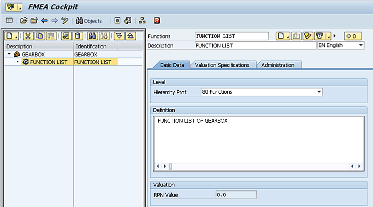 In FMEA, a function list, also known as functions, consists of a list of elements that are further broken down into individual components. The function list consists of characteristics, their associated defects, and the reasons for their occurrence. After you click the Functions options from the list of options in Figure 6, the FMEA Cockpit appears (Figure 7). In Figure 7 I enter FUNCTION LIST in the Functions field and enter a short description. I also enter relevant text in the Definition section. All this entered text is eventually visible either in FMEA or in its print preview. As soon as I enter these texts, the system automatically updates this information on the left side of Figure 7.
