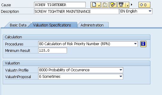 In the Valuation Specifications section in the lower half of the screen, the system enables you to select the procedure that you want to use as the valuation specification for FMEA. In my example, I use the valuation procedure to calculate the RPN. You can also define the minimum result that the system must achieve for FMEA. In other words, it acts as a benchmark to compare the actual RPN of FMEA with minimum results.