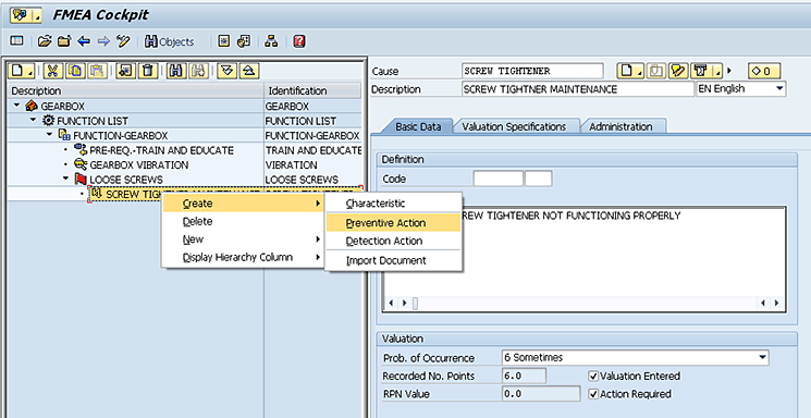 A preventive action defines the preventive measure that is put in place to ensure reduction or elimination of the cause of defect. To create a preventive action, I return to the FMEA Cockpit. I put my cursor on SCREW TIGHTENER MAINTENANCE and right-click my mouse. From the menu of options, I choose Create and then click Preventive Action (Figure 21).