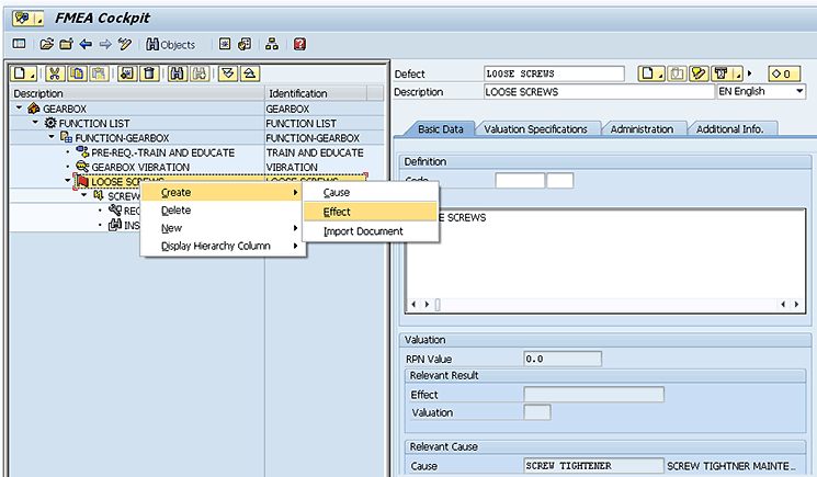 A defect is a physical or business process flaw that requires prevention or correction to increase the reliability of a product or process. To create a defect, I return to the FMEA Cockpit (Figure 13) and place my cursor on FUNCTION-GEARBOX and right-click it. From the menu of options, I choose Create and click Defect. In Figure 15, I enter LOOSE SCREWS in the Defect and Description fields and enter a description in the text box in the Definition section.