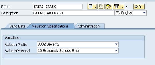 In this screen I enter FATAL CRASH in the Effect field, a short description in the Description field (FATAL CAR CRASH), and a long description in the text box in the Definition section. In the Valuation section, I choose 10 Extemely Serious Error from the drop-down list of options in the Severity field. I also enter 10.0 in the Recorded No. Points field. I click the Valuation Specifications tab to enter the benchmark value of effect or severity of this defect on the product or process. This action leads me to the screen shown in Figure 27.