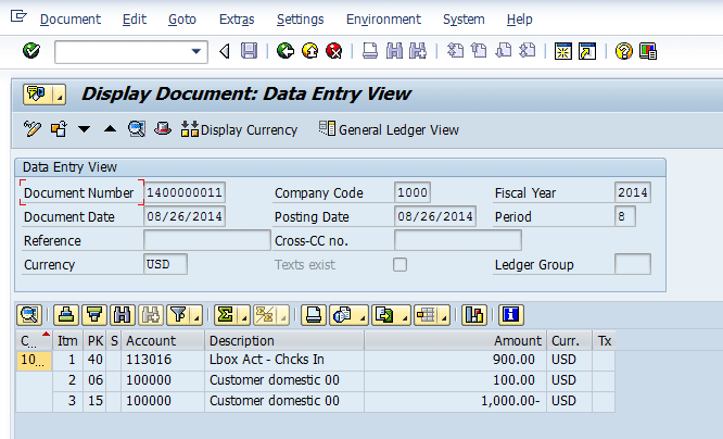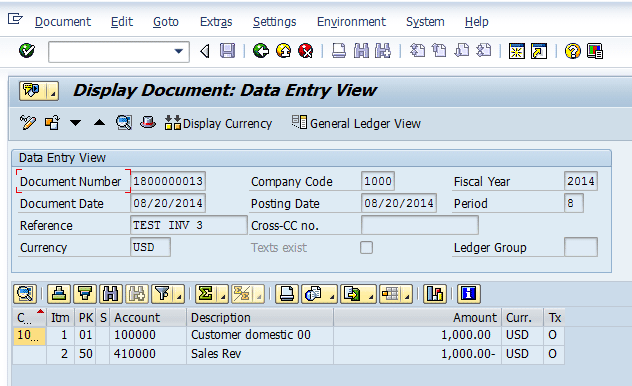To view this customer invoice that has been created in the SAP system, execute transaction code FB03 or follow menu path Accounting > Financial Accounting > Accounts Receivable > Document > Display. Figure 1 shows the customer invoice (Document Number 1800000013) created for $1,000.