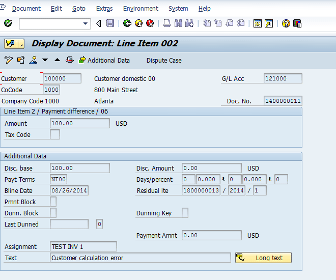 Figure 2 displays the payment received (Document Number 1400000011) from the customer through the lockbox for the amount of $900. The customer has raised a dispute case for $100, and a residual item was created for line item 2 of the document 1400000011. I assume that you are aware of the process of creating processing payments by lockbox and creating a residual item for the unpaid amount in the case of a short payment. Therefore, I do not explain the process of creating a residual item.