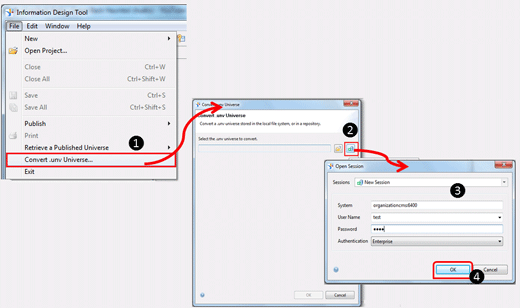 Step 4.The next step is to convert the linked universe. The universe has been exported to the BusinessObjects repository as shown in Step 2 and can be imported by connecting to the Central Management Server (CMS). To start the process, go to File > Convert unv universe as shown in 1 in Figure 6. IDT has been provided with this inbuilt feature to convert unv universes to unx universes.
