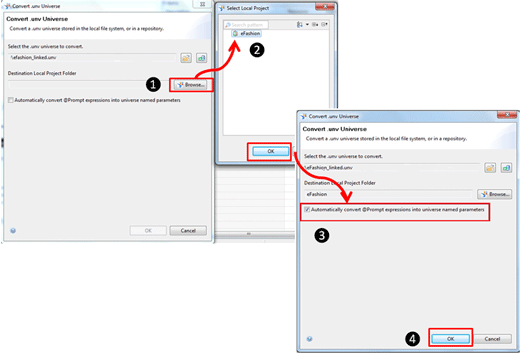 Step 9. Once the local project is selected, click the option to automatically convert @ prompts into universe-named expressions. @ prompts are created by the universe designer to facilitate universe level prompts on objects. These prompts help users to directly associate selections with objects. Selecting this option automatically converts the @ prompts into named expressions.