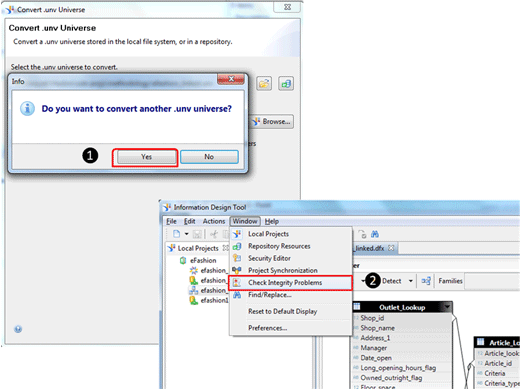 Step 12. To check if there are any problems associated with the converted universe, run the integrity check as shown in 2 of Figure 8. The Check Integrity Problems button checks for problems in object definitions, joins, contexts, and other problems in the universe. Access it from Window > Check Integrity Problems in the IDT. Checking a universe for any known divergences is a best practice to build a bug-free universe.
