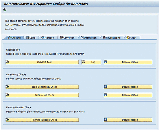The migration cockpit consists of multiple tabs, each designed to focus on specific tasks. The Checking tab (Figure 2) automates the monitoring of the best-practice guidelines and pre-requisites for migration of an existing SAP NetWeaver BW deployment to the SAP HANA platform. It is important to use this Checking tab before and after migration activities. Consistency checks and planning-function checks can also be run whenever there is a failure with activation, run reporting, or data loads.