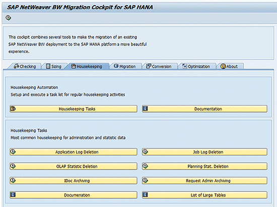 Data efficiency is critical to a successful data warehouse. One of the ways to achieve this is to closely monitor system tables to keep them from being flooded with system information. With the Housekeeping tab (Figure 4), these functions can be automated to keep the system healthy. For further details underlying system tables and the methods to keep them clean, refer to SAP Note 1829728 - BW Housekeeping Task List and to the SAP_BW_HOUSEKEEPING program.
