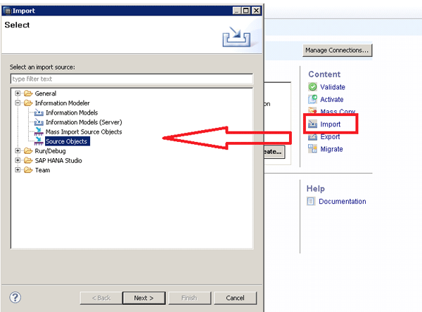 Next, select the Import option under the Content heading, and click Source Objects under the Information Modeler folder in the quick launch area (Figure 10). Click the Next button.