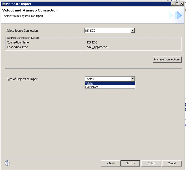 Next, select the source connections from the drop-down list. Specify your Data Services DataStore name from the drop-down menu in the Select Source Connection field (you created this DataStore in the previous steps), and the type of object to import (Figure 12).