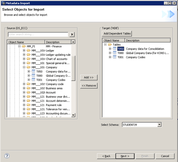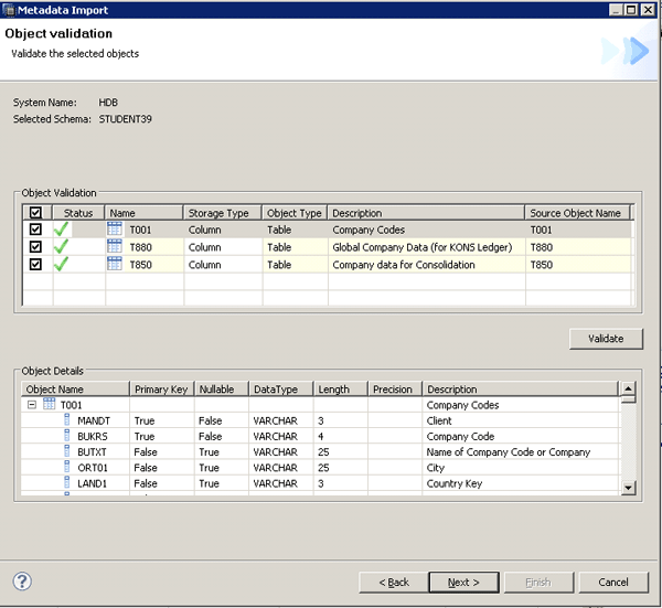 Once you save the connection, select the tables to import. For this example, select tables T850, T880, and T001 (Figure 14).