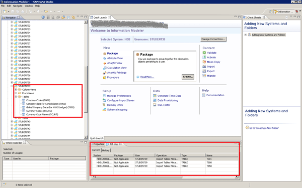 At the bottom of the next screen, you can view the logs for the jobs that imported the metadata (Figure 17). You can find the tables under the Tables sub-folder in your schema under the Catalog folder. In this example, STUDENTxx is the name of the schema.