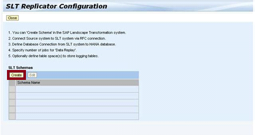 1. Use transaction code LTR to maintain SLT Replication Server configurations. Run Tx. LTR and click the Create button to create the schema (Figure 23).